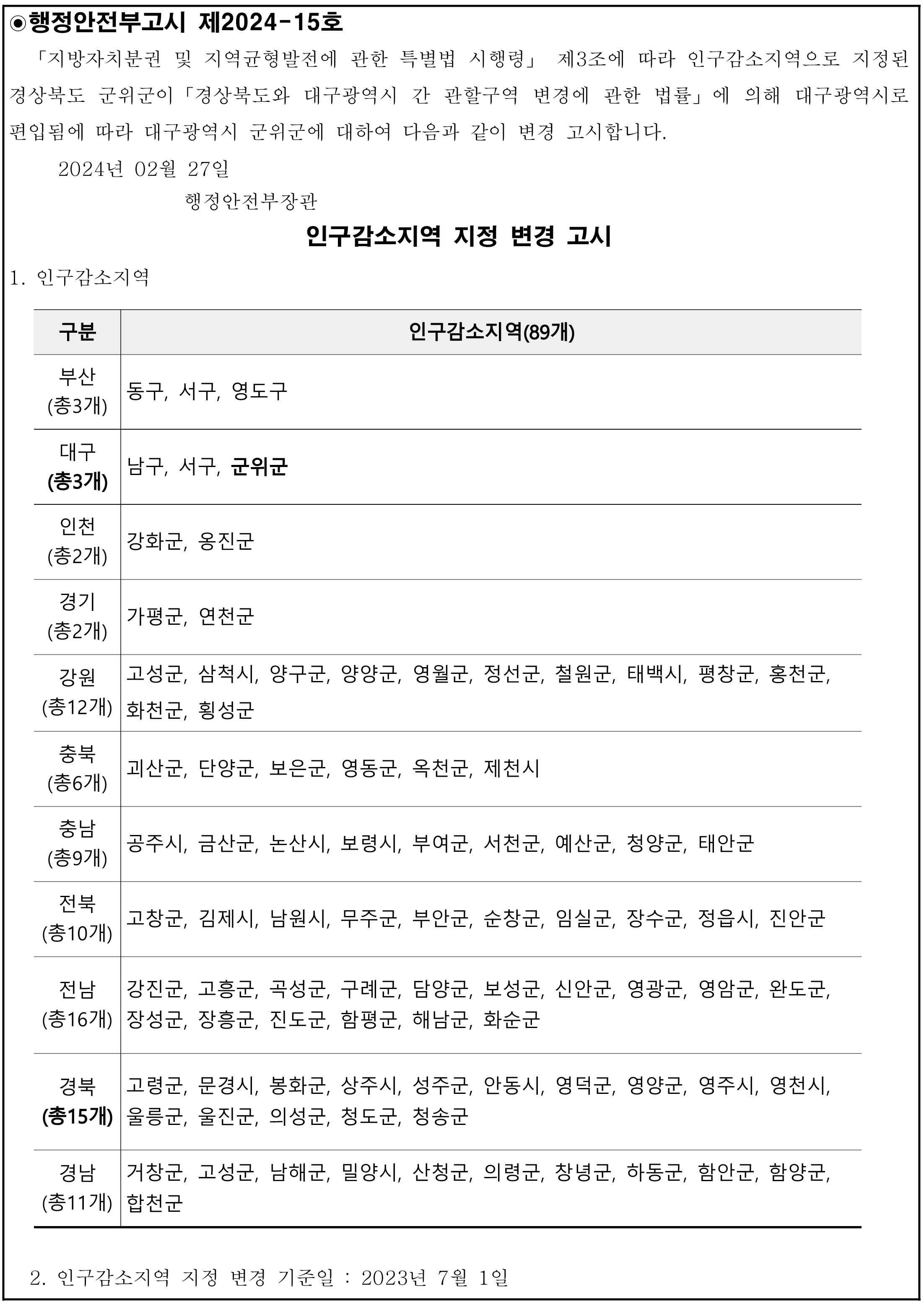 - 행정안전부 고시로 인구감소지역 지정이 변경될 수 있습니다.